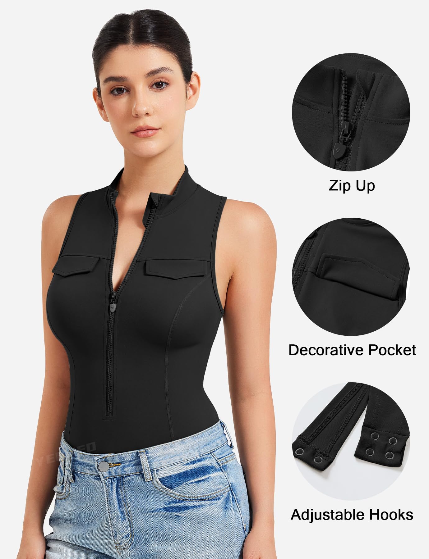YEOREO CoreFlex Workout Sexy Bodysuits for Women Sleeveless Mock Neck Zip Up Cargo Jumpsuit One Piece Thong Bodysuit Tops