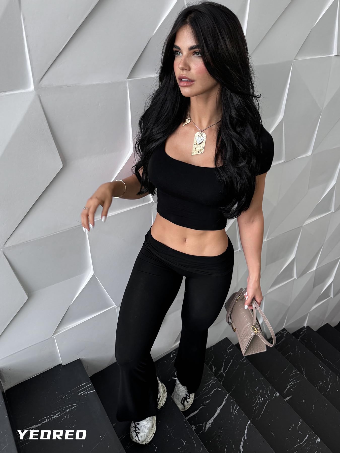 YEOREO Women Two Piece Lounge Set Outfits Short Sleeve Foldover Top Flare Pants Tracksuit Casual Sets Erna